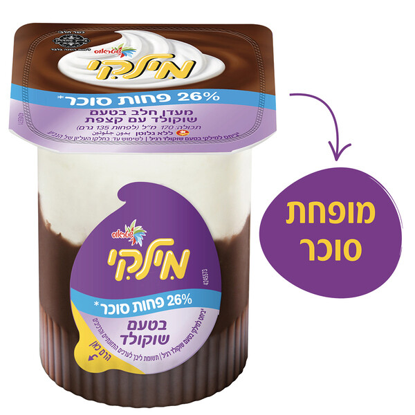 מעדן חלב בטעם שוקולד עם קצפת עם 26% פחות סוכר מילקי שטראוס